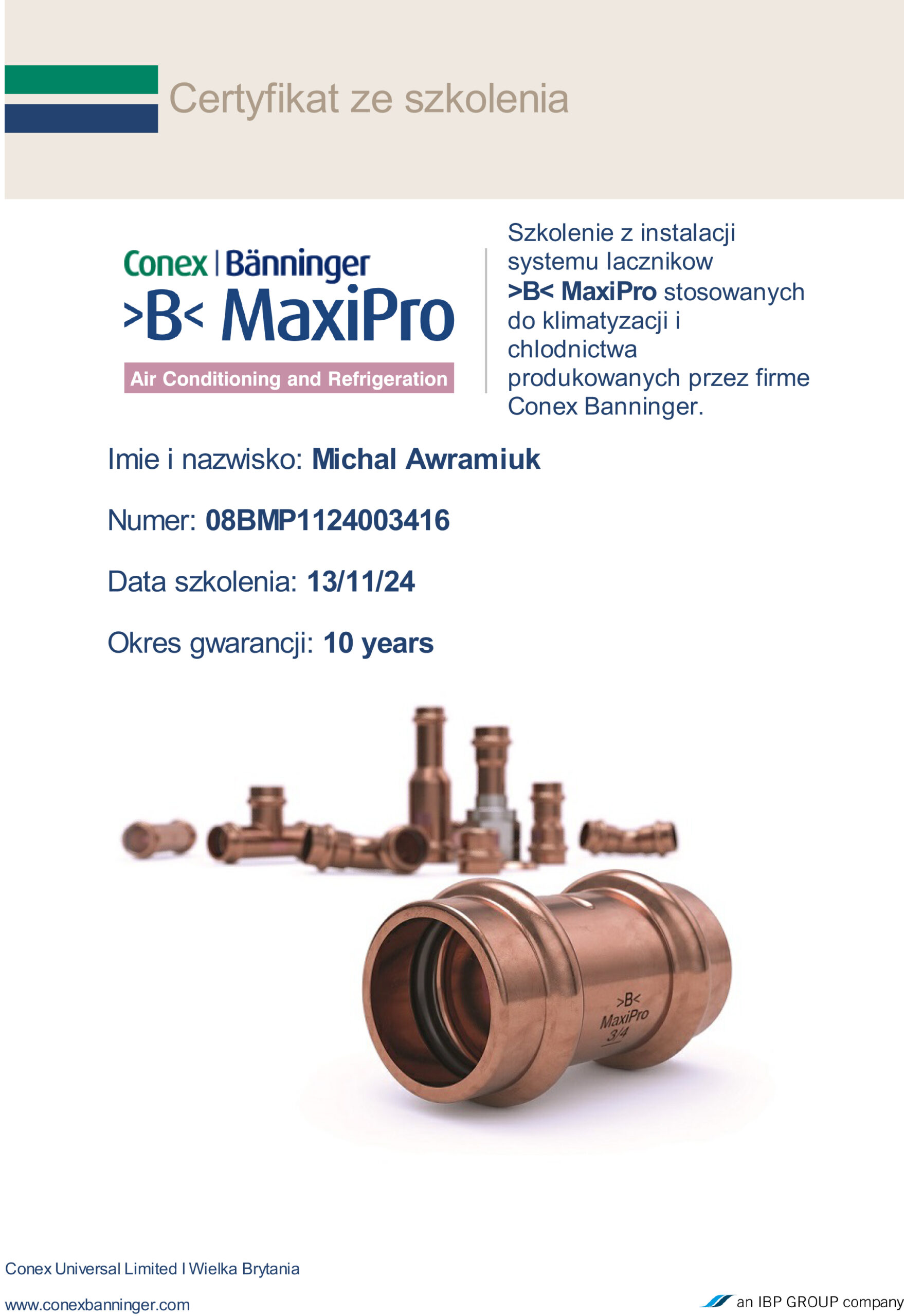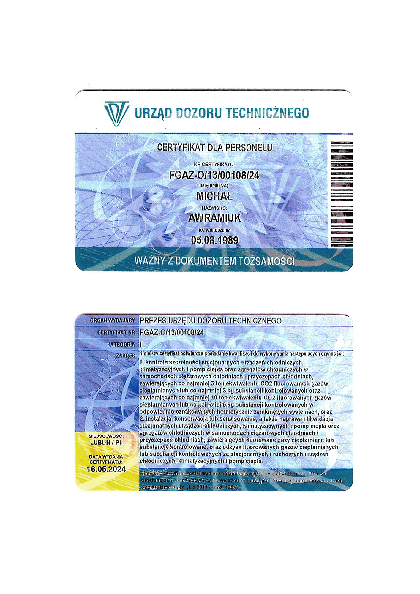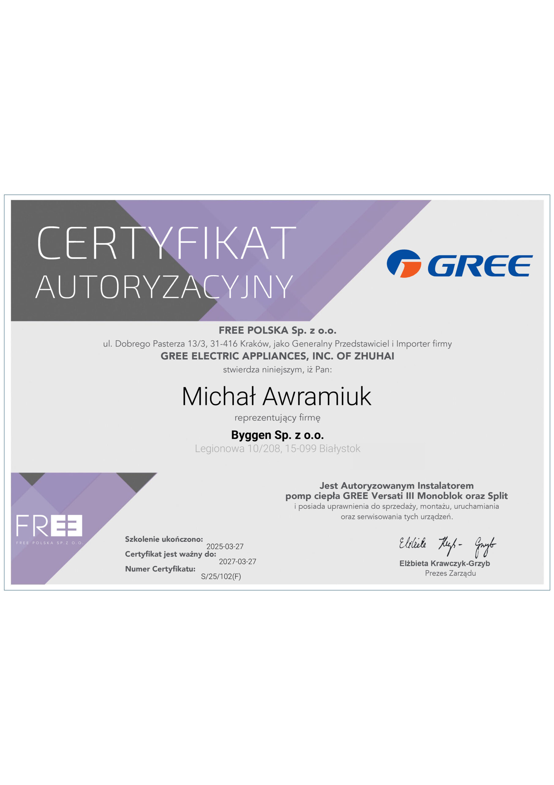 - posiadam uprawnienia F-Gazy personalne nr FGAZ-O/13/00108/24 i firmowe nr – niezbędne do legalnej instalacji urządzeń zawierających czynniki chłodnicze;