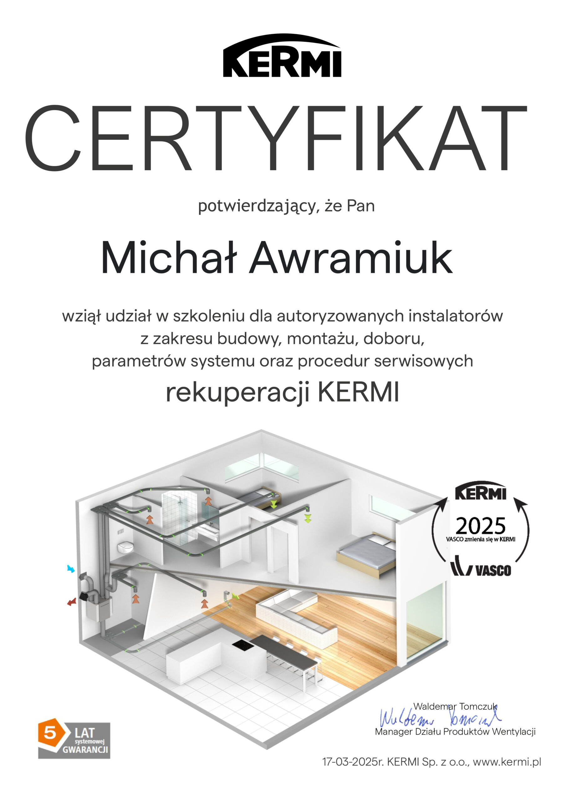 - jestem autoryzowanym instalatorem rekuperacji Kermi (zyskujesz 5 lat gwarancji producenta);