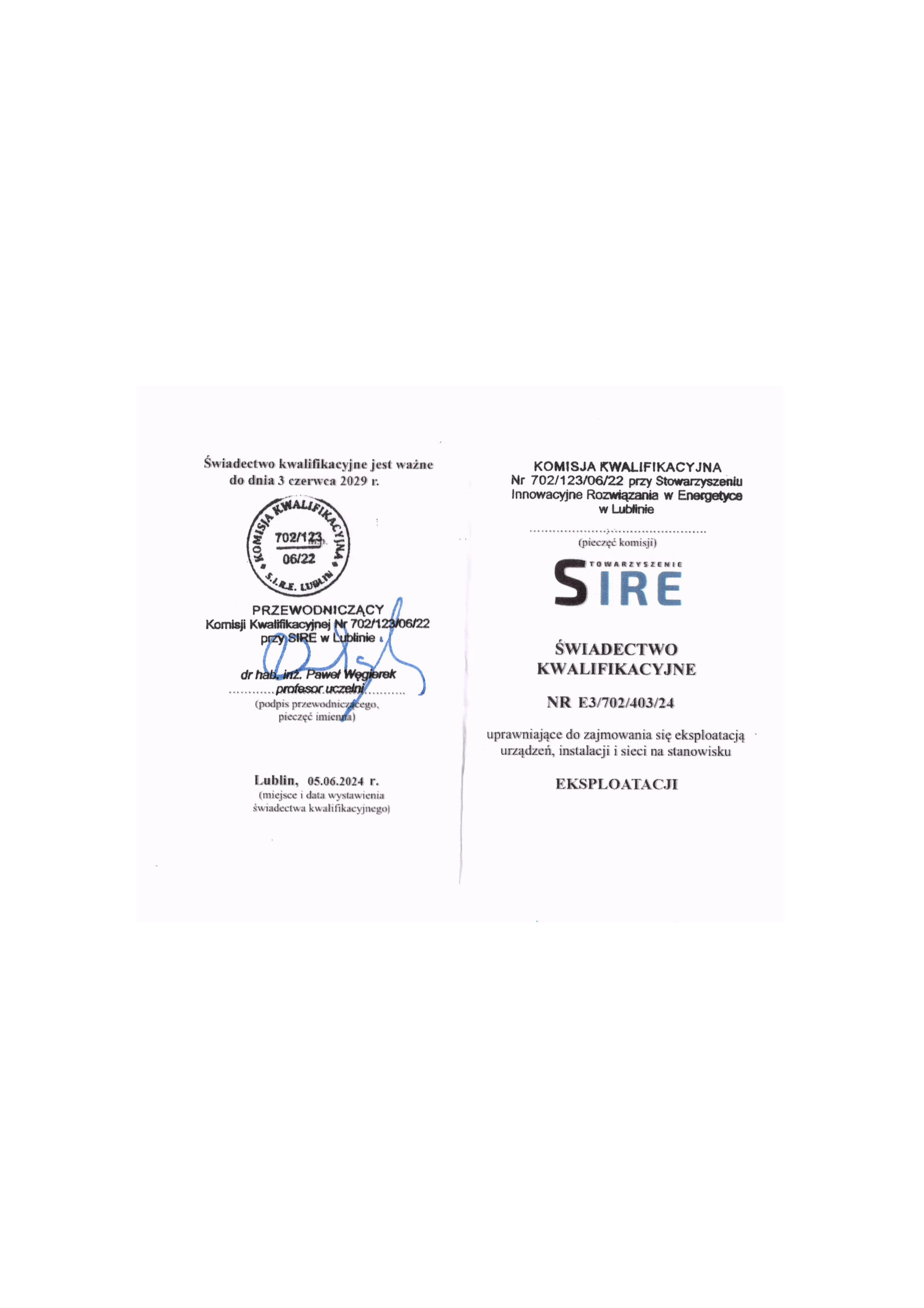 - uprawnienia energetyczne elektryczne G1E w zakresie obsługi, konserwacji, remontu lub naprawy, montażu lub demontażu urządzeń, instalacji i sieci elektroenergetycznych do 1kV;